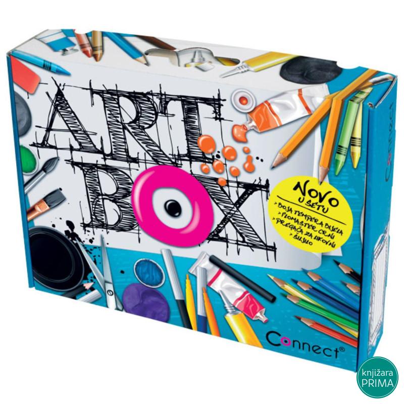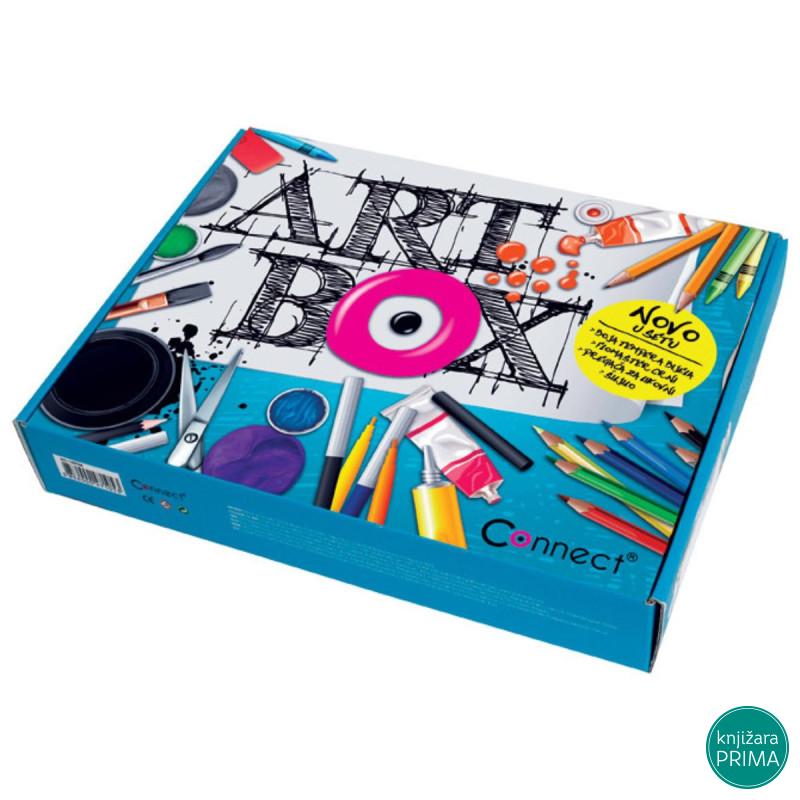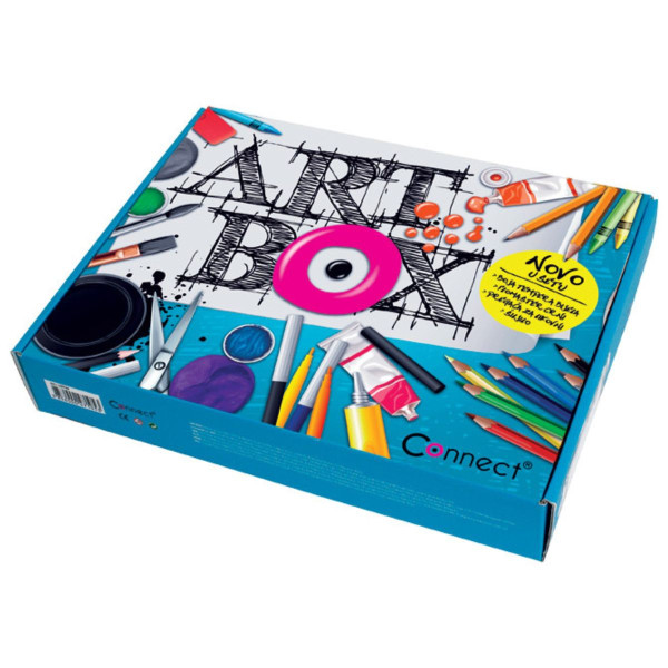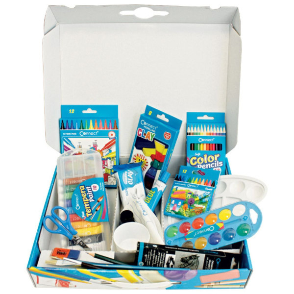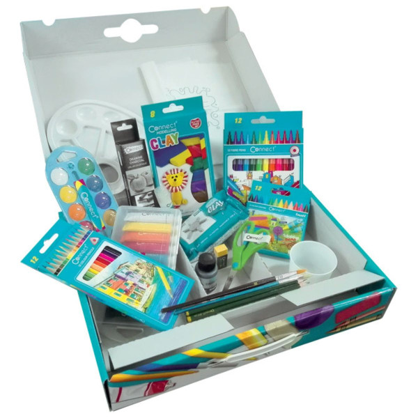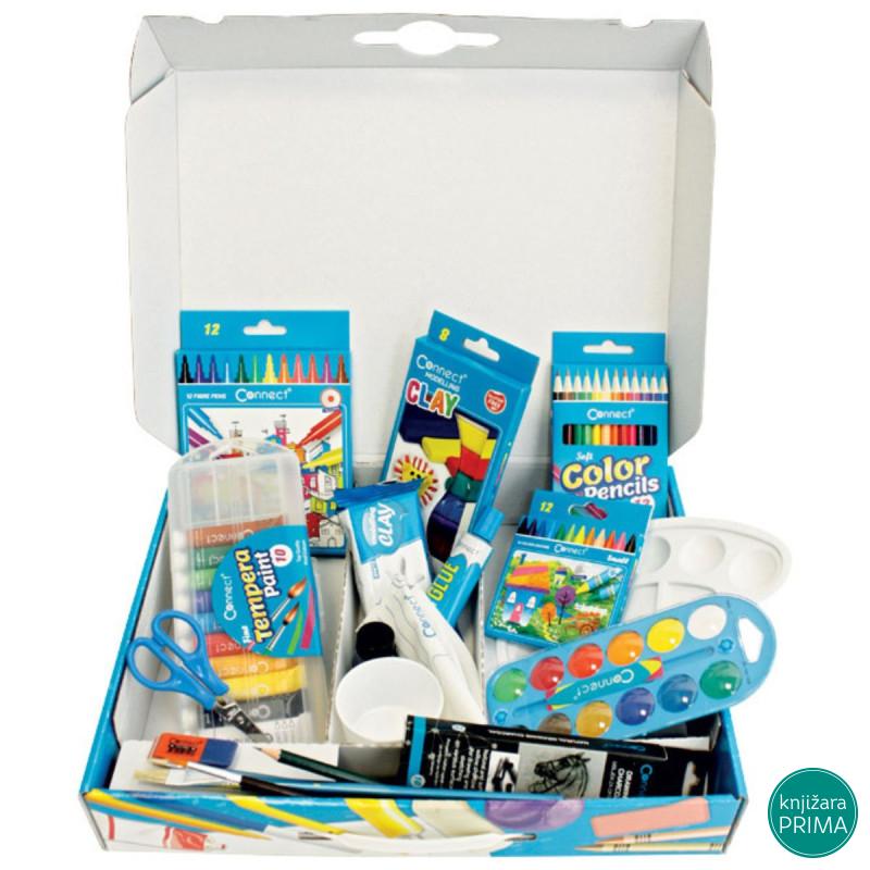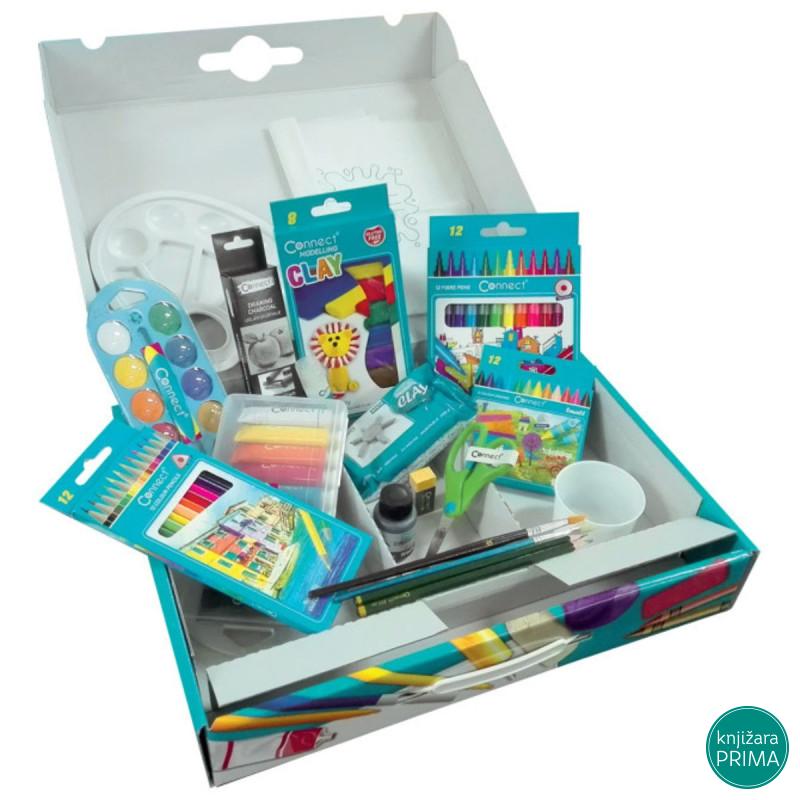 set sadrži: flomaster 12boja, boje drvene 12boja, boje tempere 12ml 10boja, boje vodene fi 23mm 12boja, plastelin 8boja, glinamol 0,45kg terakota, boje voštane 12boja, ugljen pk6, tuš 30ml crni, paleta ovalna, lepak tečni 50ml, četkice pk5, makaze 13cm, olovka grafitna pk2, čaša za likovno, gumica i rezač; u kartonskoj kutiji sa ručkom