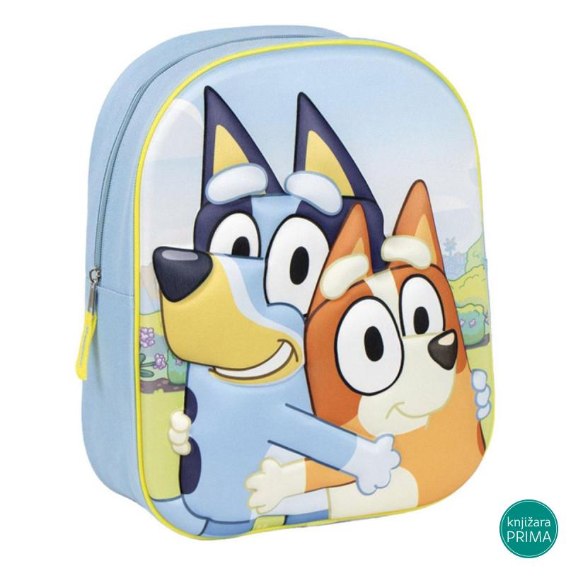 Veseli 3D ranac sa likom Bluey idealan je za vrtić ili izlete! Ima jednu glavnu pregradu sa zipom, bočni džep, udobne naramenice i ručku za nošenje. Napravljen je od kvalitetnih materijala (67% poliester, 33% EVA).