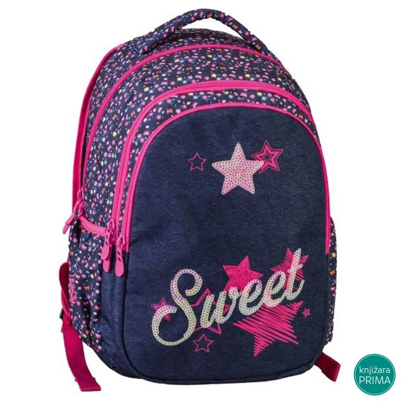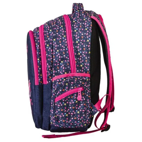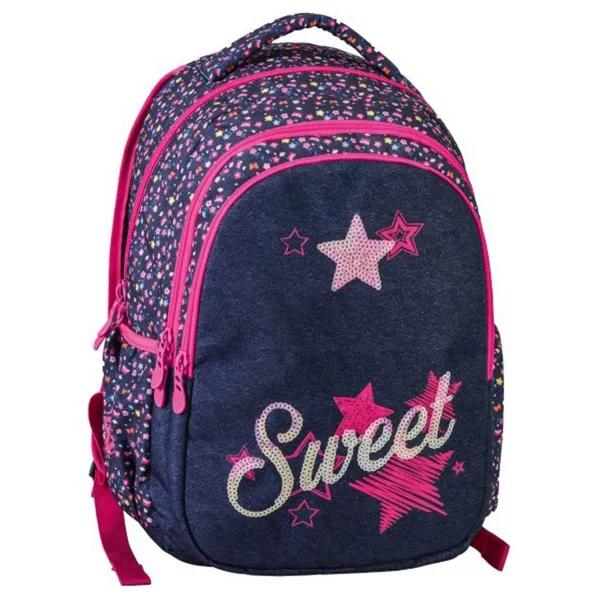Zetta ranac Sweet blue jeans Samostojeći triput obšiven vodootporna tkanina visokokvalitetni poliester reflektujuće bezbednosne trake podesive ramenice ramenice u obliku banane meka ručica za nošenje lagan i izdržljiv džepovi sa strane dupli džep sa strane sa ziperom EVA ergo leđa štampana postava. Dimenzije: 46 x 34 x 20 cm Težina: 640g Materijal: poliester 600D Aplikacija: sublimacija transfer štampa i krljušt Leđa: EVA ergo Ziperi: SBS / metalni potezači