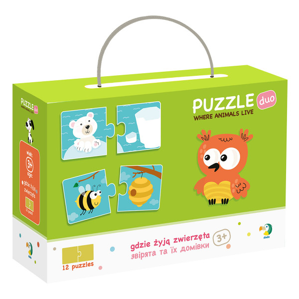 Jednostavna slagalica za najmlađe. Saznaj gde žive životinje. Upari životinju i njeno mesto stanovanja. Slagalice sastoje od dva dela. Pakovanje sadrži 24 delova iz kojeg se može složiti 12 pari. Veličina delova je prilagođen za najmanje rukice i lako se spajaju. Dimenzije kutije: 18 x 12 x 6 ?m