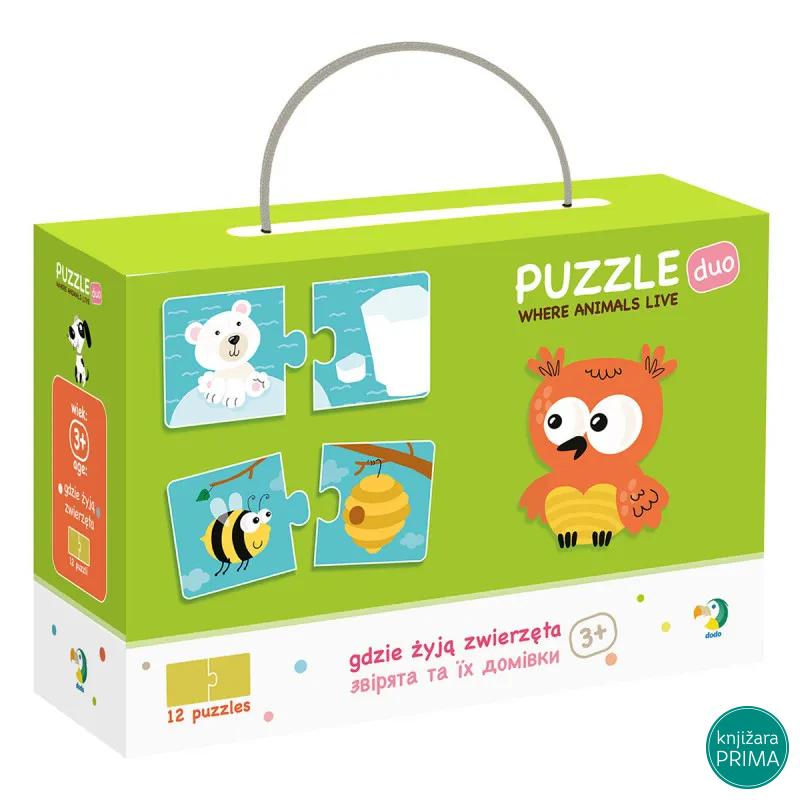 Jednostavna slagalica za najmlađe. Saznaj gde žive životinje. Upari životinju i njeno mesto stanovanja. Slagalice sastoje od dva dela. Pakovanje sadrži 24 delova iz kojeg se može složiti 12 pari. Veličina delova je prilagođen za najmanje rukice i lako se spajaju. Dimenzije kutije: 18 x 12 x 6 ?m. Detaljnije