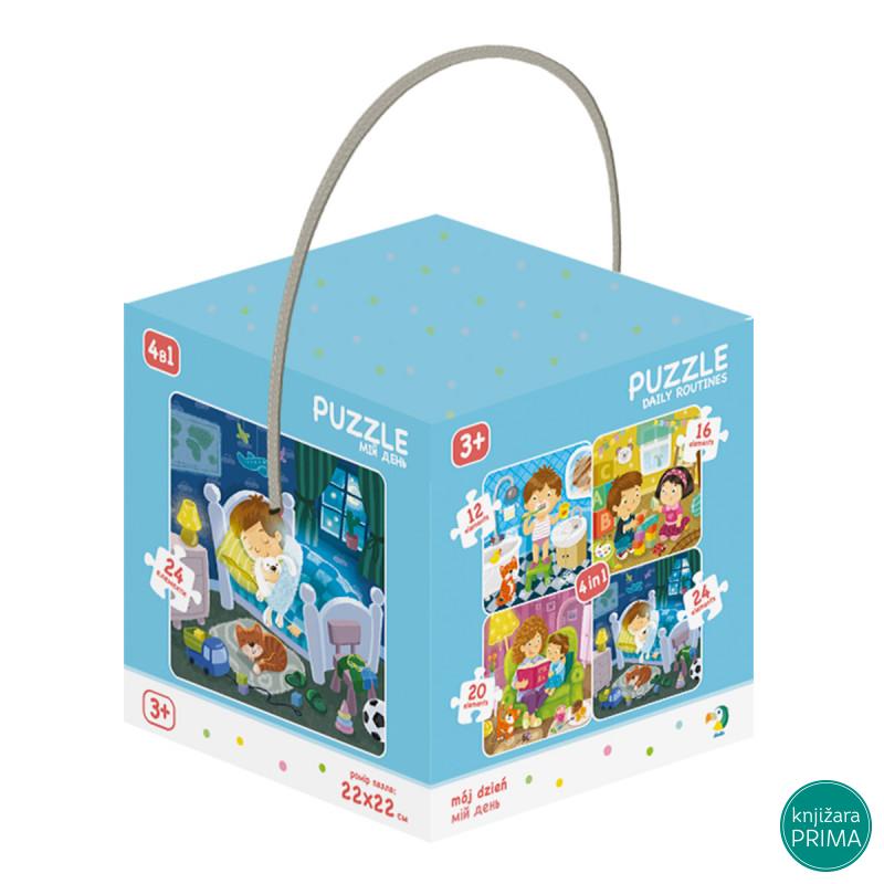 4 u 1 slagalice - dnevna rutina. U ovoj kutiji sa drškom se nalaze 4 slagalice od 1216 20 i 24 delova. Saznaj šta sva deca rade u toku jednog dana. Dimenzije kutije: 15x15x15 cm. Dimenzije gotove slike: 22x22 cm