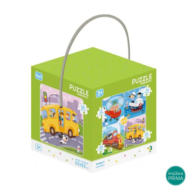 4 u 1 slagalice - saobraćaj. U ovoj kutiji sa drškom se nalaze 4 slagalice od 1216 20 i 24 delova. Upoznaj najznačajnije tipove saobraćaja. Dimenzija kutije: 15x15x15 cm. Dimenzija gotove slike: 22x22 cm . Detaljnije