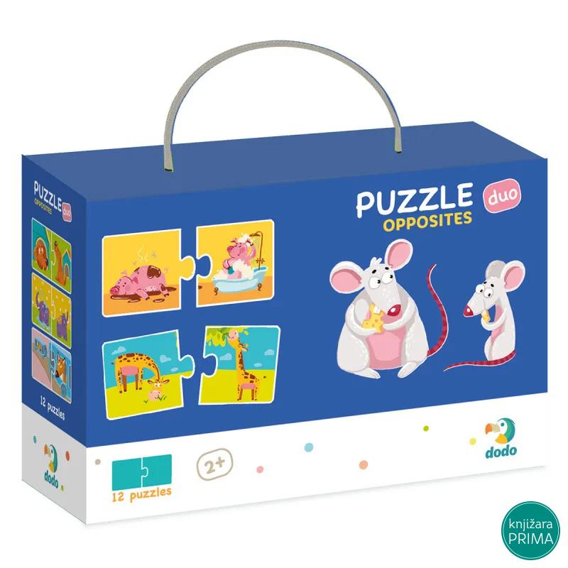Jednostavna slagalica za najmlađe. Uz pomoć životinja nauči šta su suprotnosti. Pronađi velikog miša i upari ga sa malim. Slagalice sastoje od dva dela. Pakovanje sadrži 24 delova iz kojeg se može složiti 12 parova. Veličina delova je prilagođen za najmanje rukice i lako se spajaju. Dimenzije kutije: 18 x 12 x 6 cm