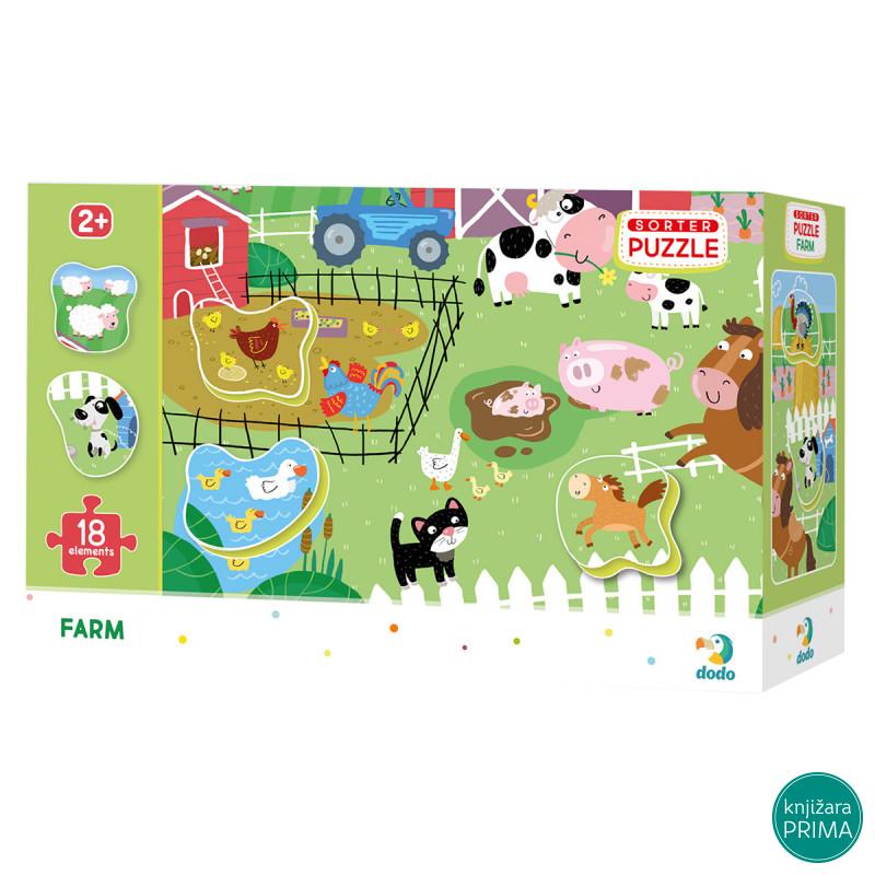Slagalica - umetaljka. Upoznaj životinje sa farme i saznaj gde žive. Pakovanje sadrži 12 većih delova i 6 manjih umetaka. Dimenzije pakovanja 25 x 16 x 65 cm Dimenzije gotove slike 31 x 45 cm . Detaljnije