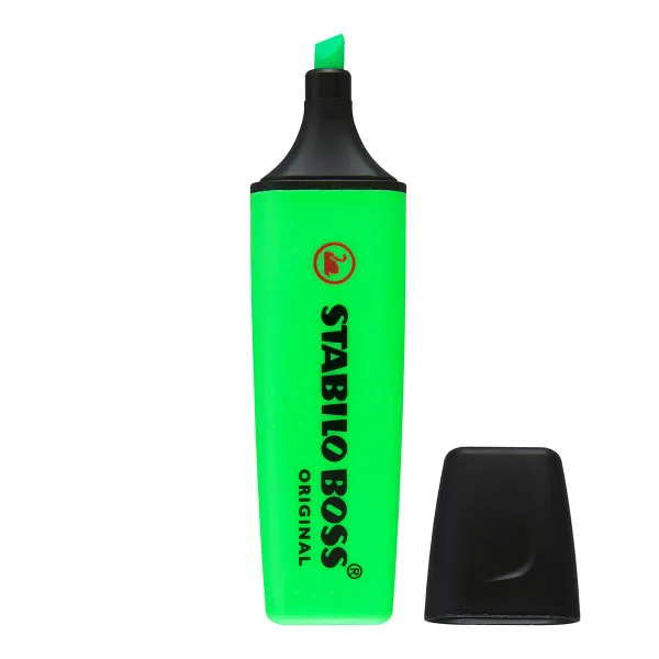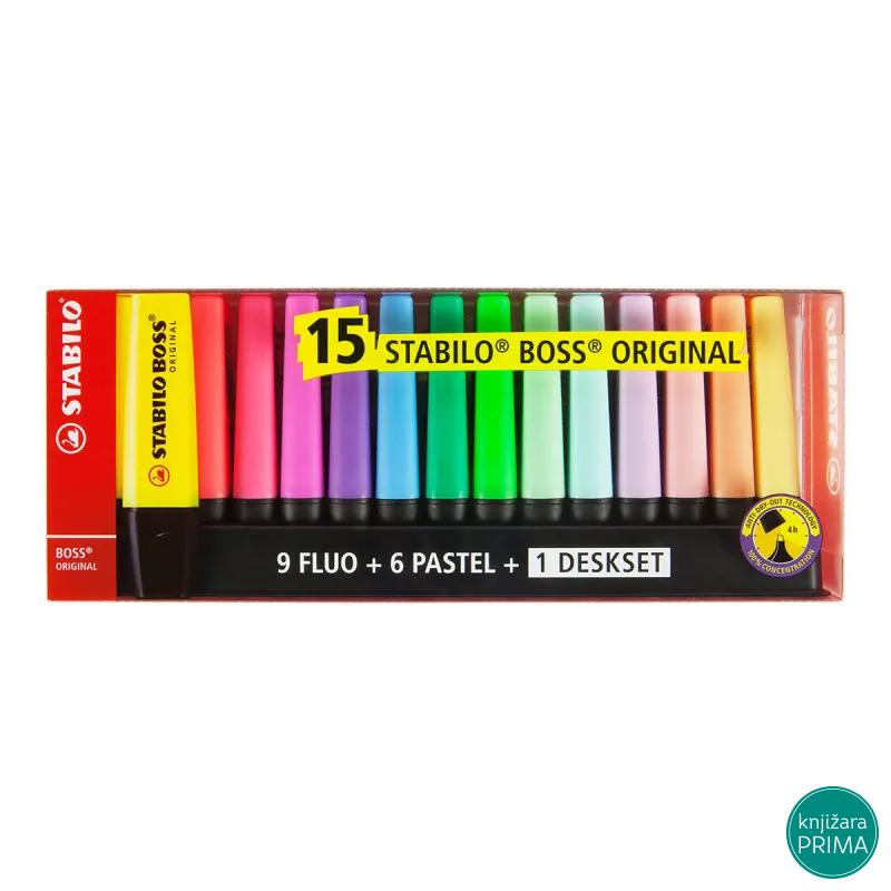 Stoni set sa 15 različitih boja Stabilo Boss marketa za podvlačenje. Markeri su na bazi vode i brzo se suše ergonomski dizajnirani da dobro stoje u ruci. Stabilo je razvio tehnologiju "Anti-Dry" koja omogućava da marketi budu bez poklopca do četiri sata bez isušivanja!