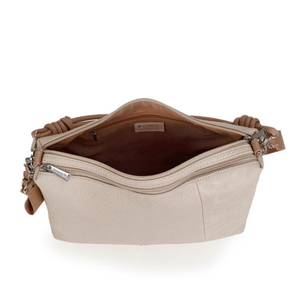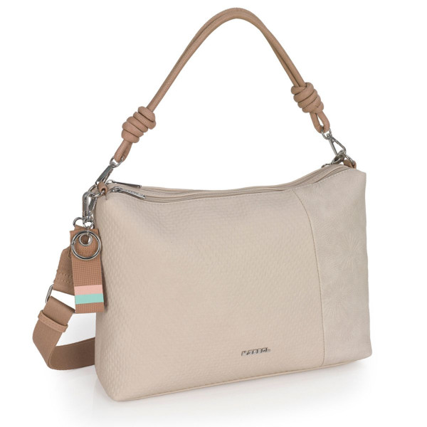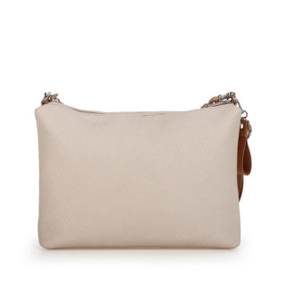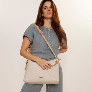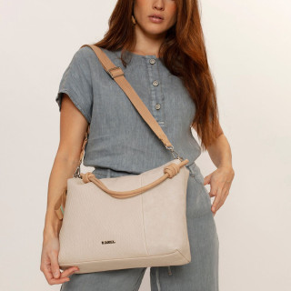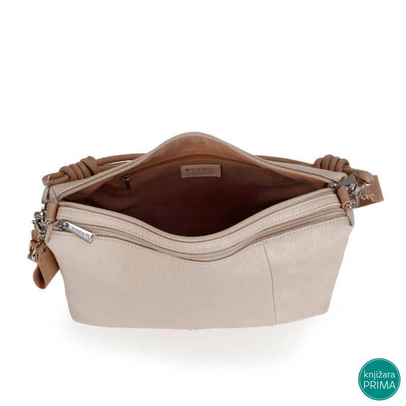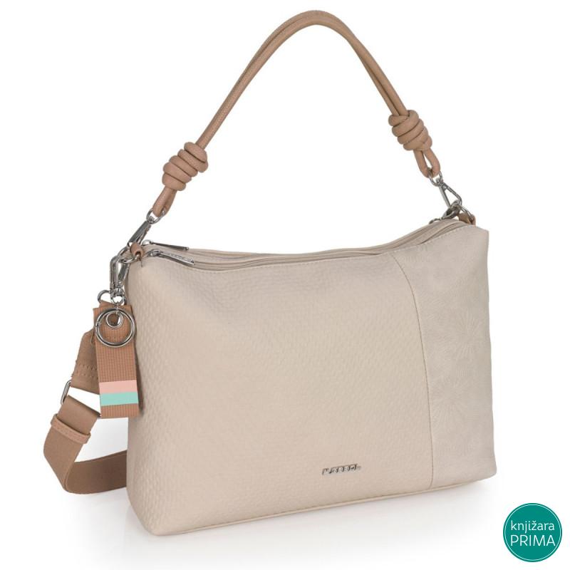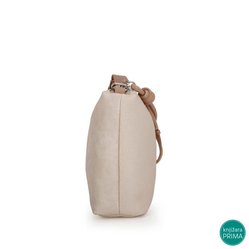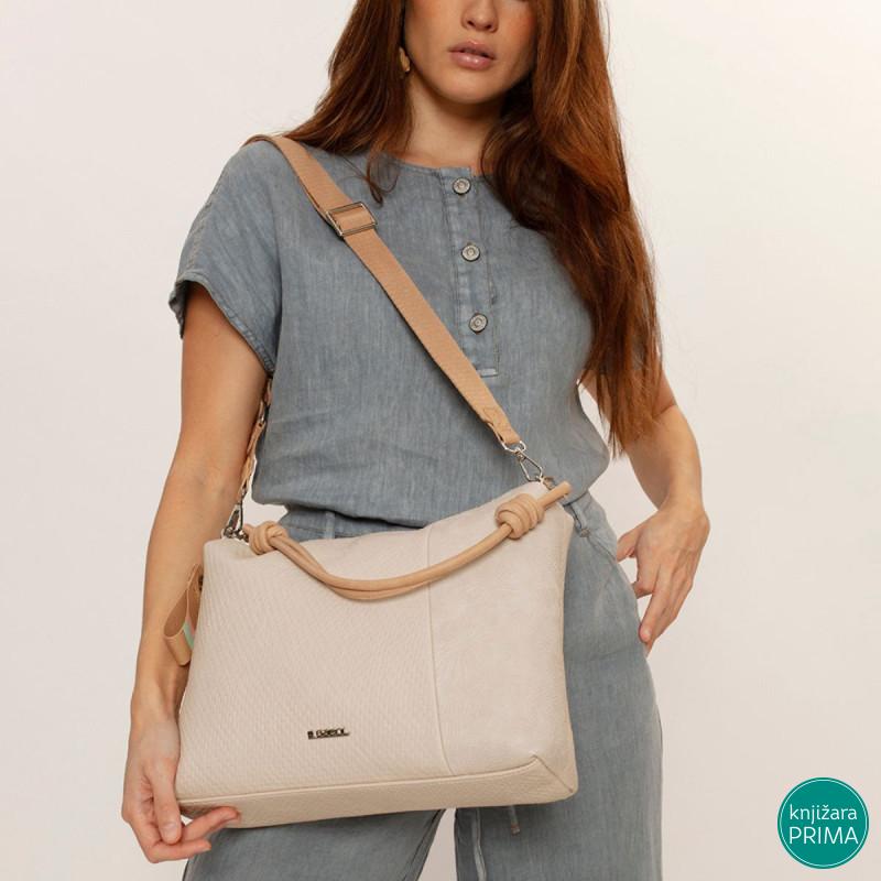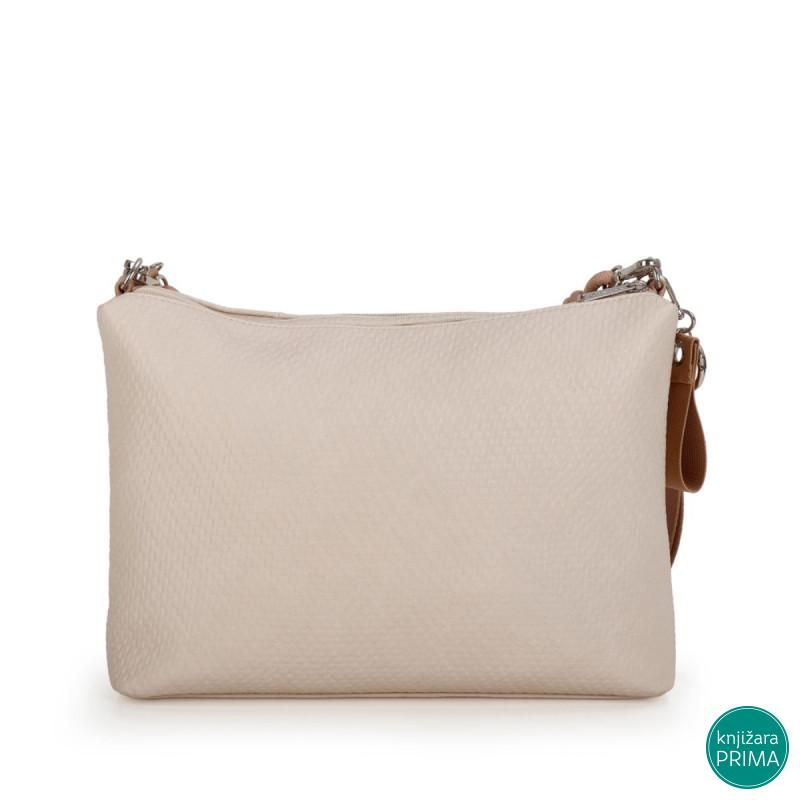 Klasična srednja torba, minimalistički dizajnirana i stilski veoma dobro uklopiva. Kaiš za preko ramena i zanimljivo dizajnirana ručka za nošenje u ruci. Nema spoljašnje džepove, ali poseduje dve odvojene velike pregrade, svaka sa sopstvenim zip zatvaranjem. Uz svaku torbu dolazi privezak za ključeve.
