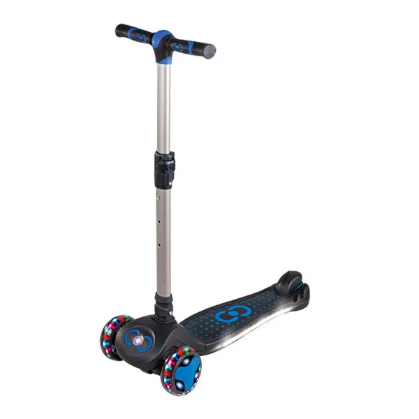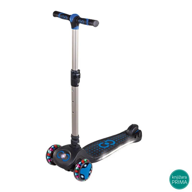 Trotinet sa tri točka Svetleći silikonski točkovi Lak za upravljanje Nosivost do 50 kg Aluminijumska šipka podesiva visina na 3 nivoa (rotirajuća glava u kolenu trotineta). Materijal: aluminijum plastika guma i silikoninijum plastika guma i silikon Uzrast: 6g+