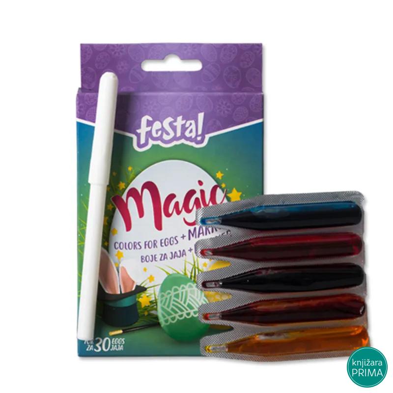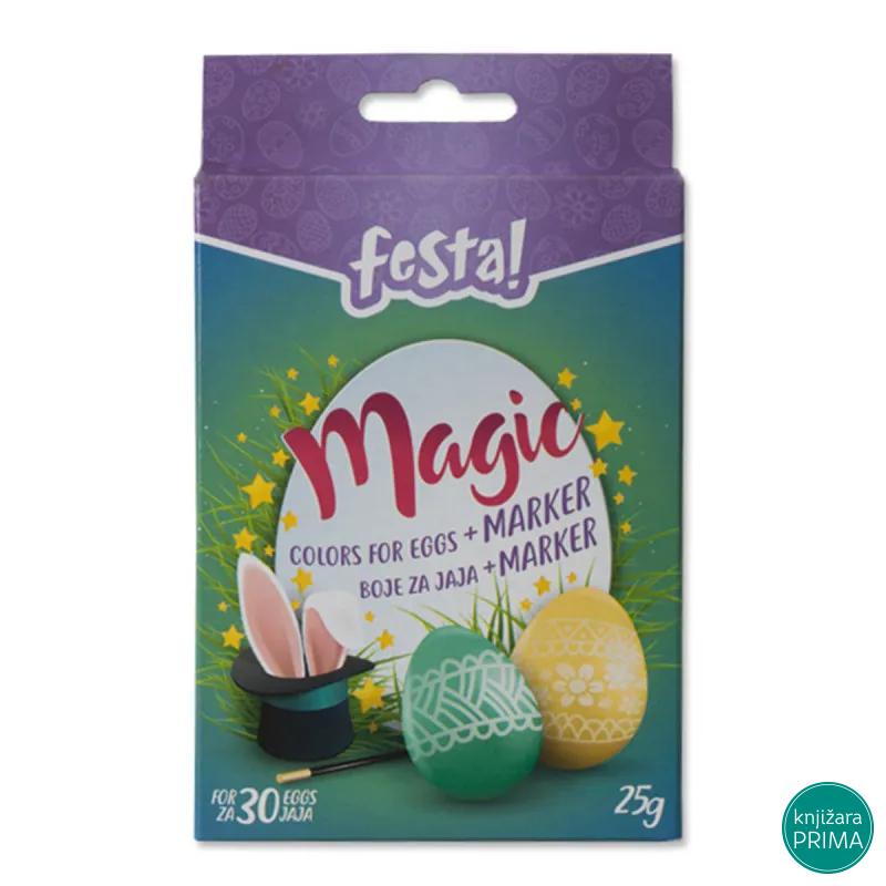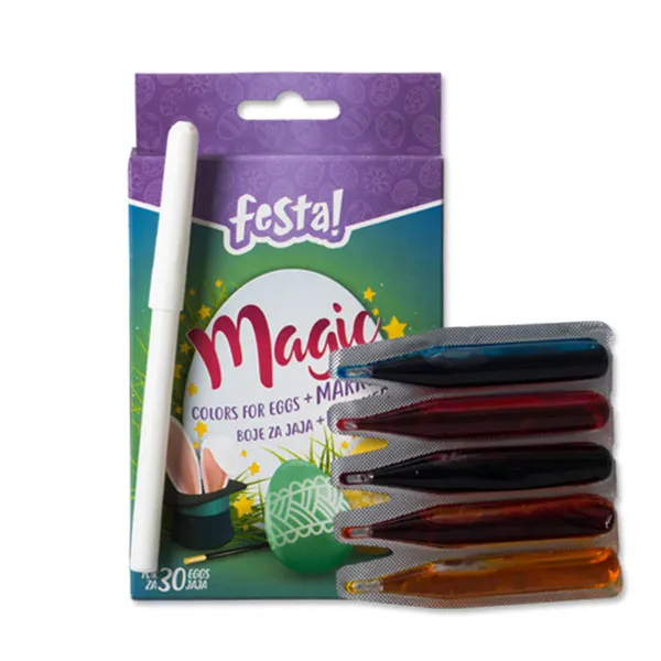 Set za dekorisanje uskršnjih jaja koji se sastoji od 5 tečnih boja i magične olovke koja briše boju sa jajeta. Dovoljno za bojenje 30 jaja. Set sadrži 5 tečnih boja i jednu magičnu olovku. Težina: 25 gr