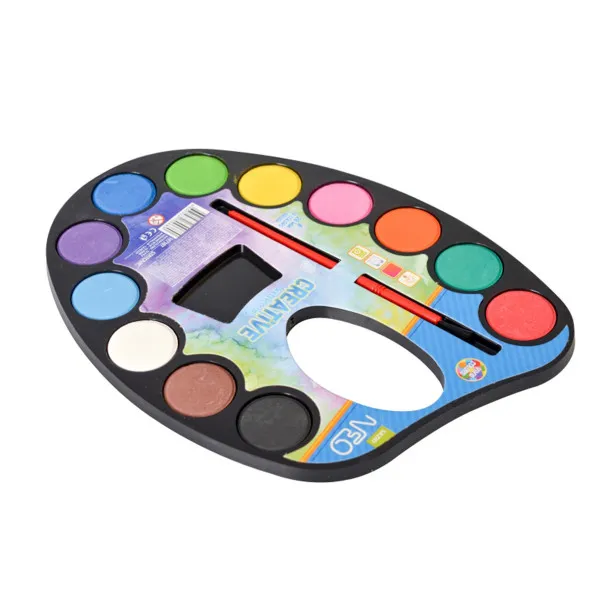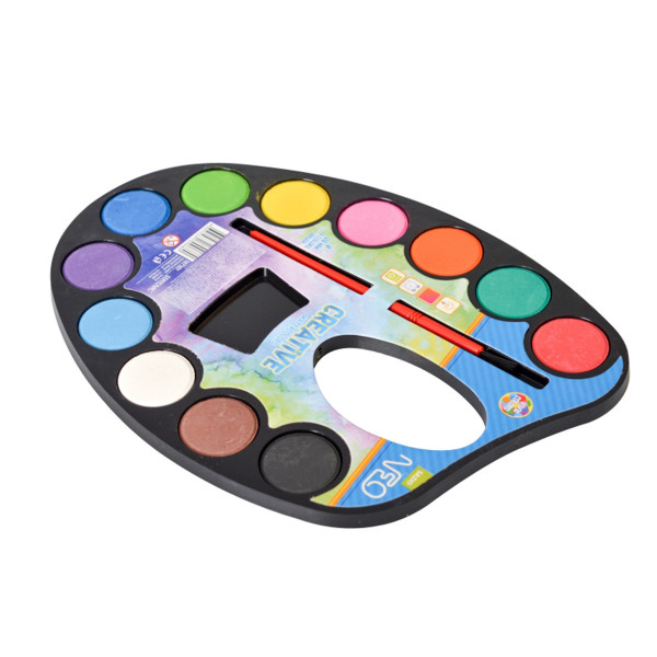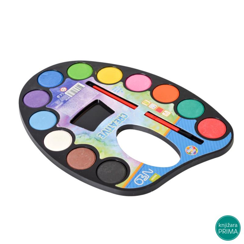 Sazio vodene boje sa plastičnom četkicom i širokim spektrom 12 živopisnih boja. PVC pakovanje u u obliku slikarske palete. Neprozirne boje ostavljaju prekrasan trag na papiru. Prečnik svake boje je 28mm