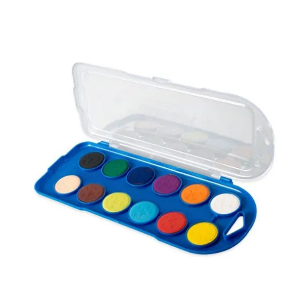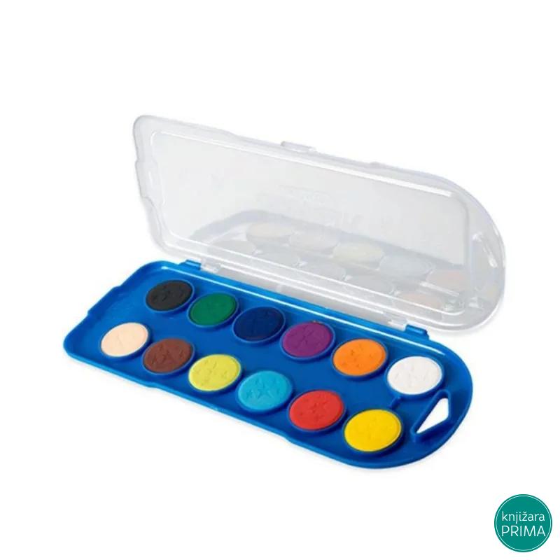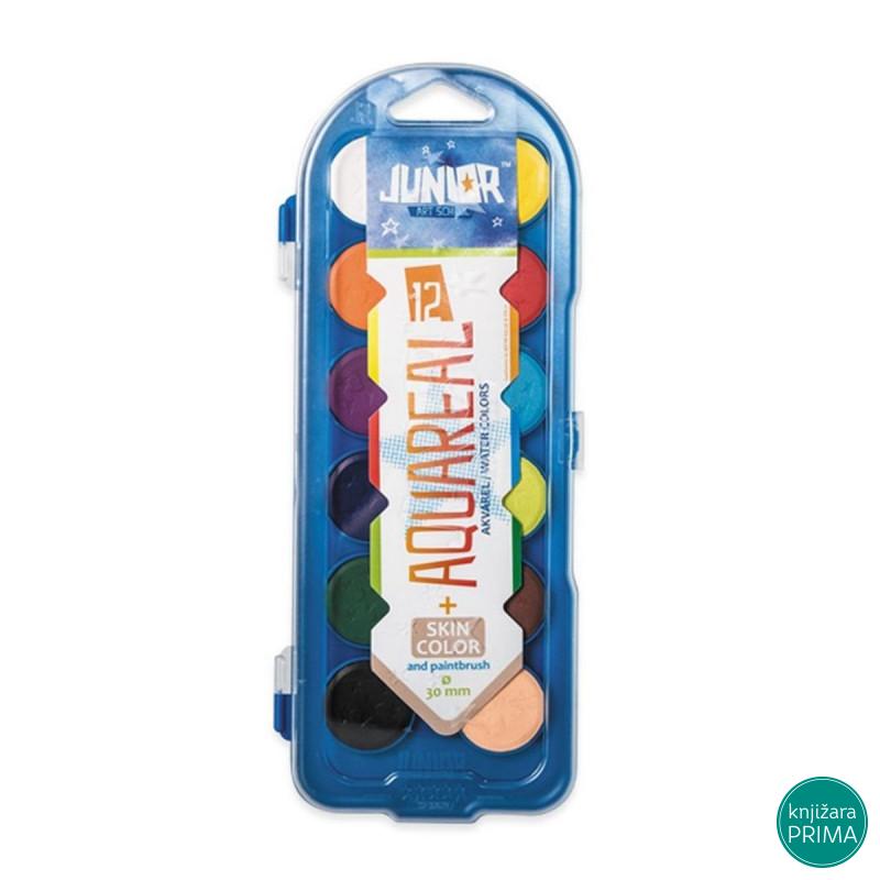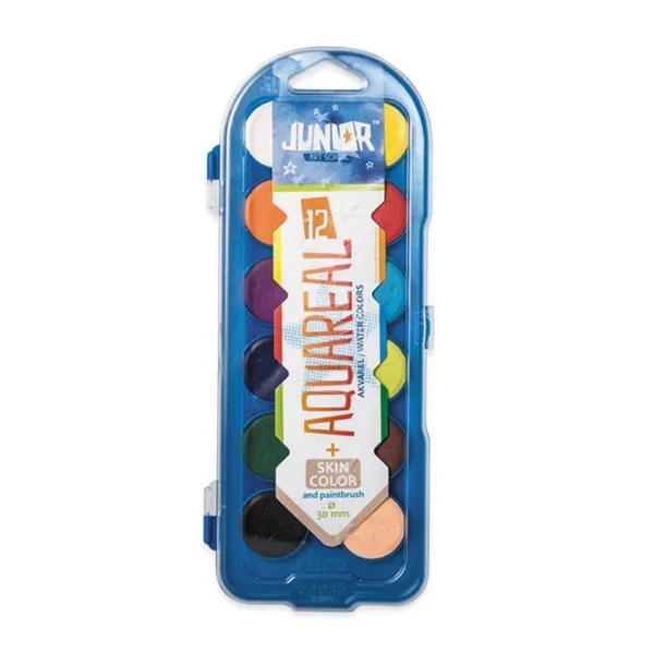 AquaReal JUNIOR vodena boja sa drvenom četkicom i širokim spektrom 12 živopisnih boja među kojima je i boja kože. Neprozirne boje izrađene od kvalitetnog pigmenta ostavljaju prekrasan trag na papiru. Prečnik svake boje je 30mm.