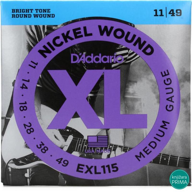 D\'Addario EXL115 žice za električnu gitaru EXL115 is the popular choice for players who prefer moderate flexibility and a full beefy tone. XL Nickel Wound D\'Addario\'s most popular electric guitar strings are precision wound with nickelplated steel onto a carefully drawn hexagonally shaped high carbon steel core. The result strings with long lasting distinctive bright tone and excellent intonation is ideal for the widest variety of guitars and musical styles. Preferred for their moderate flexibility and rich full tone Round wound with nickelplated steel for distinctive bright tone Environmentally friendly corrosion resistant packaging for strings that are always fresh Made in the U.S.A. for the highest quality and performance String Gauges: Plain Steel .011 .014 .018 Nickel Wound .028 .038 .049