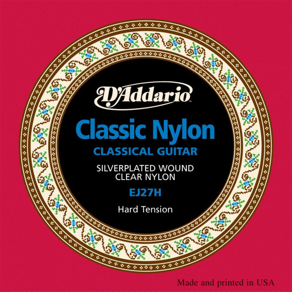 D\'Addario\'s EJ27H Classic Nylon guitar strings are great for beginners students and professionals alike. This hard tension set contains 3 clear nylon trebles and 3 silver-plated copper wound basses for the optimal balance of warm and projecting long lasting tone. D\'Addario\'s EJ27 Classic Nylon guitar strings are great for beginners students and professionals alike. Each set contains 3 clear nylon trebles and 3 silver-plated copper wound basses for the optimal balance of warm and projecting long lasting tone. Each set is held to same high standards as our professional string sets and may be used for all players looking for an inexpensive but reliable set. The normal tension set is available for full and fractional 1/2 and 3/4 size classical guitars. D\'Addario\'s premier entry level classical string set known for its optimal balance of warmth and projection Hard tension Clear Nylon Non-Ball End A great balance of value and reliability Environmentally friendly corrosion resistant packaging for strings that are always fresh Made in the U.S.A. for the highest quality and performance